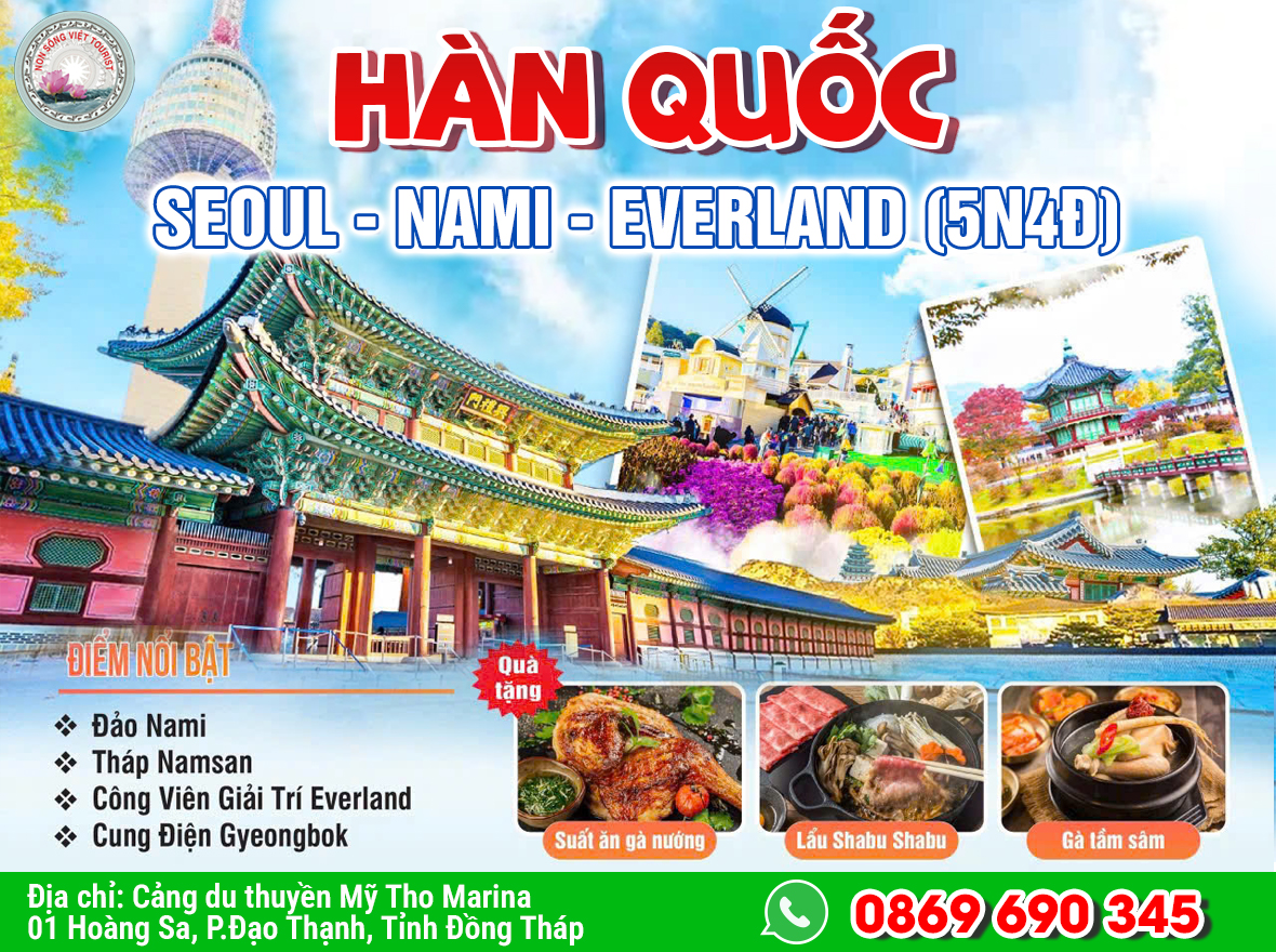 Đảo Nami, Xem Painter Hero Show, Học Làm Kim Chi – Mặc Hanbok Truyền Thống, Làng Văn Hóa Namsan, Tháp Namsan, Công Viên Giải Trí Everland, Phố Myeongdong, Cung Điện Gyeongbok,…