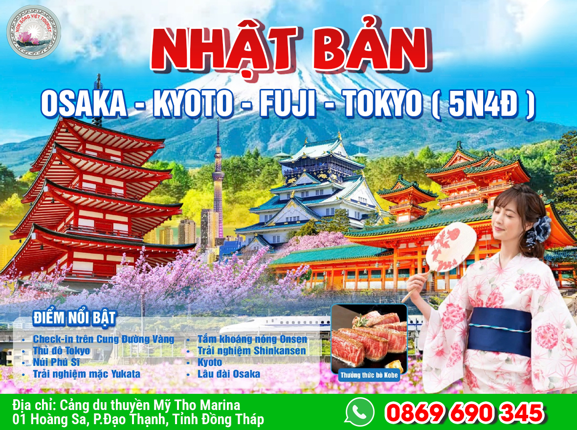 Thưởng thức ẩm thực Nhật Bản: Bò Kobe + Chân Cua Tuyết, thưởng thức Trà Đạo truyền thống Nhật Bản, Chùa Thanh Thuỷ Kiyomizu, Núi Phú Sĩ, Làng cổ Oshino Hakkai,, trải nghiệm mặc Yukata – tắm khoáng nóng Onsen, trải nghiệm tàu Shinkansen, Lâu đài Osaka,…
