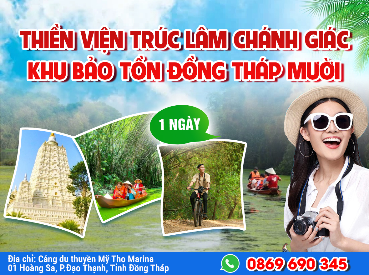 06h00: Xe và HDV Công ty Du Lịch Non Sông Việt đón quý khách tại Cảng Du Thuyền Mỹ Tho, Đoàn dùng điểm tâm sáng. Sau đó khởi hành đi Tân Phước. 08h30: Quý khách tham quan Trại rắn Đồng Tâm, nơi đây chuyên nghiên cứu, bảo tồn và nuôi dưỡng các loài rắn lớn nhất Việt Nam, đồng thời là điểm du lịch đặc thù gắn với y học cổ truyền. Quý khách tham quan 3 khu vực chăm sóc rắn chính là khu vực hồ nước, khu nuôi rắn độc và khu nuôi trăn, nhà bảo tàng rắn, các loài động vật như: cá sấu, gấu, công, đà điểu, kỳ đà, vượn má vàng,…và các loài động vật quý hiếm khác. 09h30: Quý khách tham quan Khu bảo tồn Đồng Tháp Mười: - Tự do lên tháp quan sát ngắm toàn cảnh rừng và các loài chim nước. - Đi xuồng chèo lướt trên thảm bèo xanh ngát và khám phá các loài chim nước, rừng tràm nguyên sinh - Trải nghiệm vào rừng bằng xe đạp. - Cánh Đồng Khóm Tân Phước, quý khách đi xe điện tham quan Vườn khóm, mua đặc sản Khóm Tân Phước mang vị ngọt nơi đất phèn và kẹo khóm do người dân tự tay làm. 11h30: Quý khách dùng cơm trưa tại nhà hàng trong Khu du lịch. Sau đó tự do nghỉ ngơi. 13h30: Quý khách tham quan Thiền Viện Trúc Lâm Chánh Giác là một trong những thiền viện lớn nhất Việt Nam được mệnh danh “Tiểu Ấn Độ” có bảo tháp chính cao 31m với lớp sơn trắng toát lên vẻ uy nghi, hoa văn chạm khắc tinh xảo góp phần thu hút khách đến check – in, “sống ảo”. 17h30: Về đến điểm hẹn ban đầu, kết thúc chuyến tham quan. Chia tay và hẹn gặp lại Quý khách Trên Mọi Nẻo Đường Cùng Du Lịch Non Sông Việt !!!! |